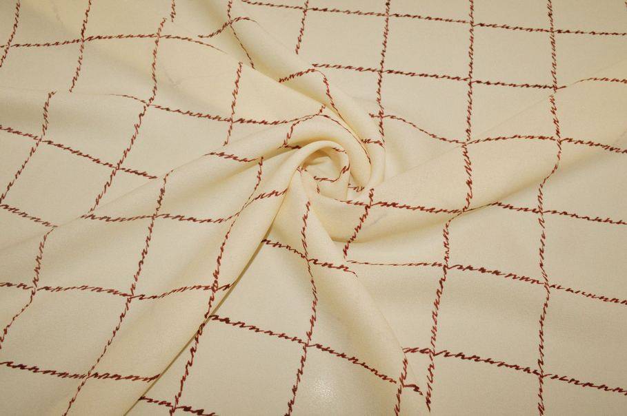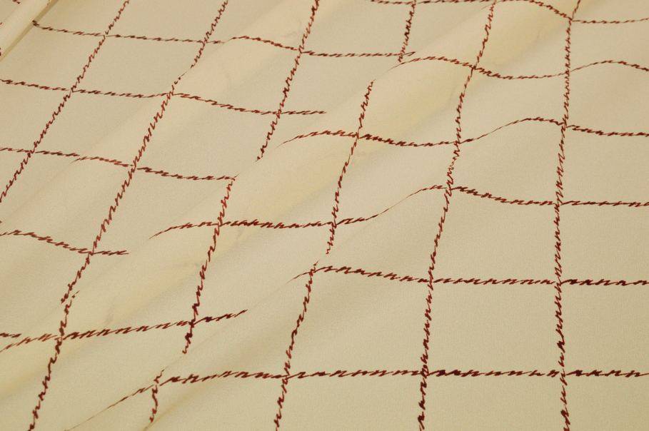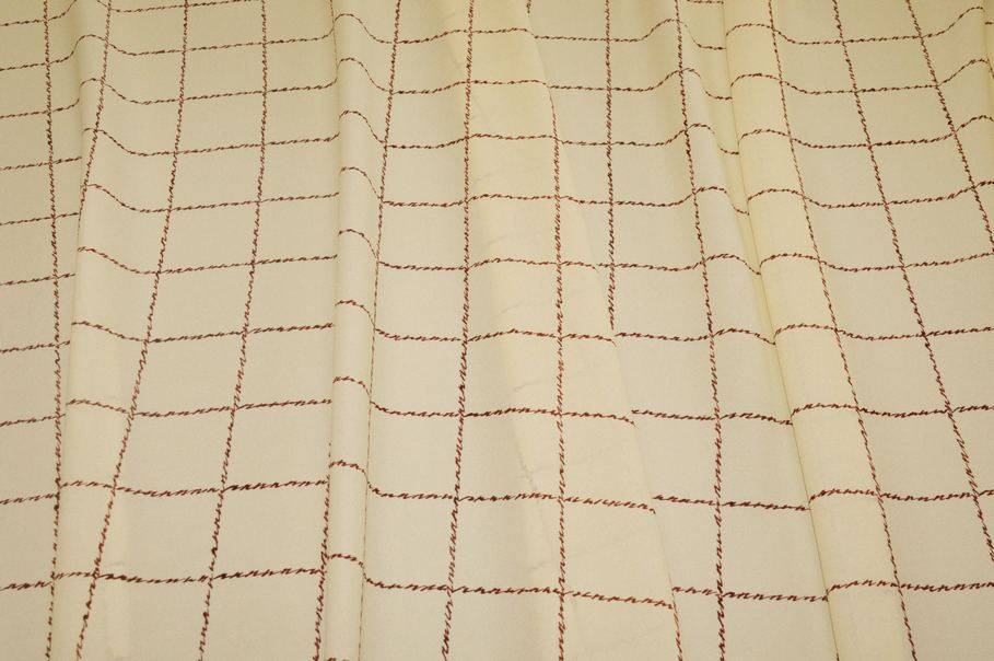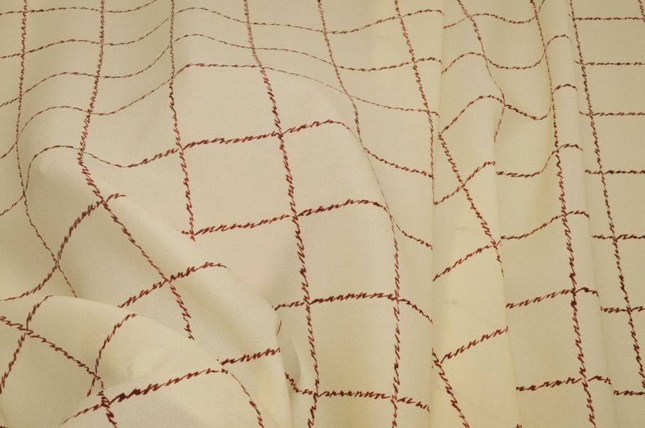 La tonalità di fondo, un giallo paglierino/crema, è arricchita da un elegante disegno finestrato a quadri bordeaux, caratterizzato da una linea irregolare che conferisce un effetto molto particolare al tratto della linea, come se fosse tracciata a mano. Ideale per abiti corti e lunghi, gonne morbide o con volant, camicette, top e foulard eleganti.
