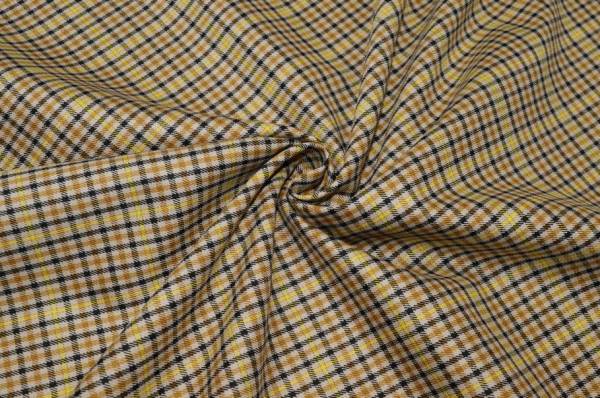 Il tessuto poliviscosa è una fibra sintetica che unisce la morbidezza della viscosa con la resistenza del poliestere. Ha una mano e piacevole al tatto, ma al contempo resistente e leggero. Il design a quadretti beige con righine gialle ed arancioni conferisce un aspetto elegante e al tempo stesso originale e giocoso, adatto a look sia classici che formali. Con un peso di 280 grammi al metro lineare è ideale per realizzare pantaloni, giacche, tailleur, gonne, top e abiti.