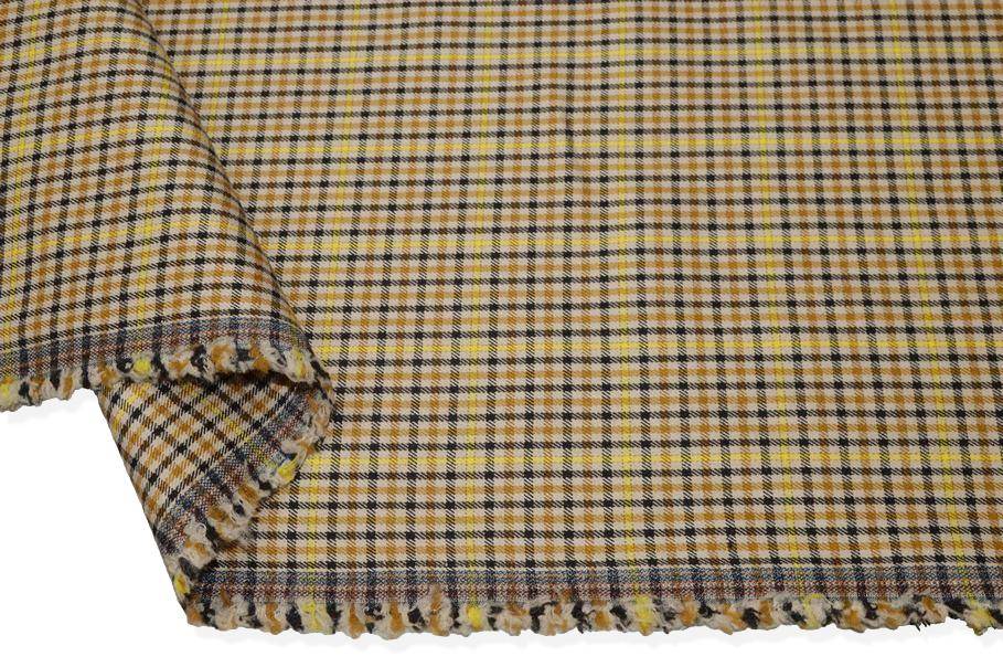 Il tessuto poliviscosa è una fibra sintetica che unisce la morbidezza della viscosa con la resistenza del poliestere. Ha una mano e piacevole al tatto, ma al contempo resistente e leggero. Il design a quadretti beige con righine gialle ed arancioni conferisce un aspetto elegante e al tempo stesso originale e giocoso, adatto a look sia classici che formali. Con un peso di 280 grammi al metro lineare è ideale per realizzare pantaloni, giacche, tailleur, gonne, top e abiti.