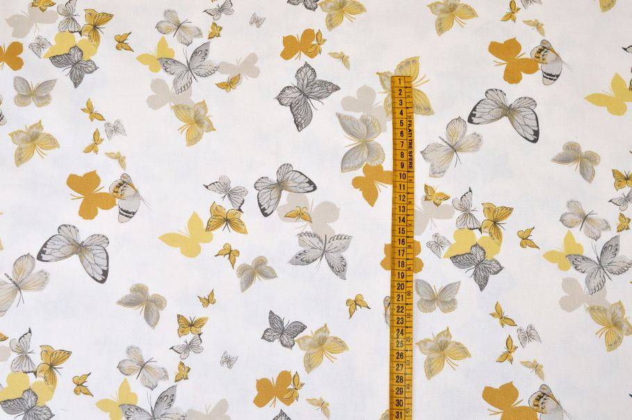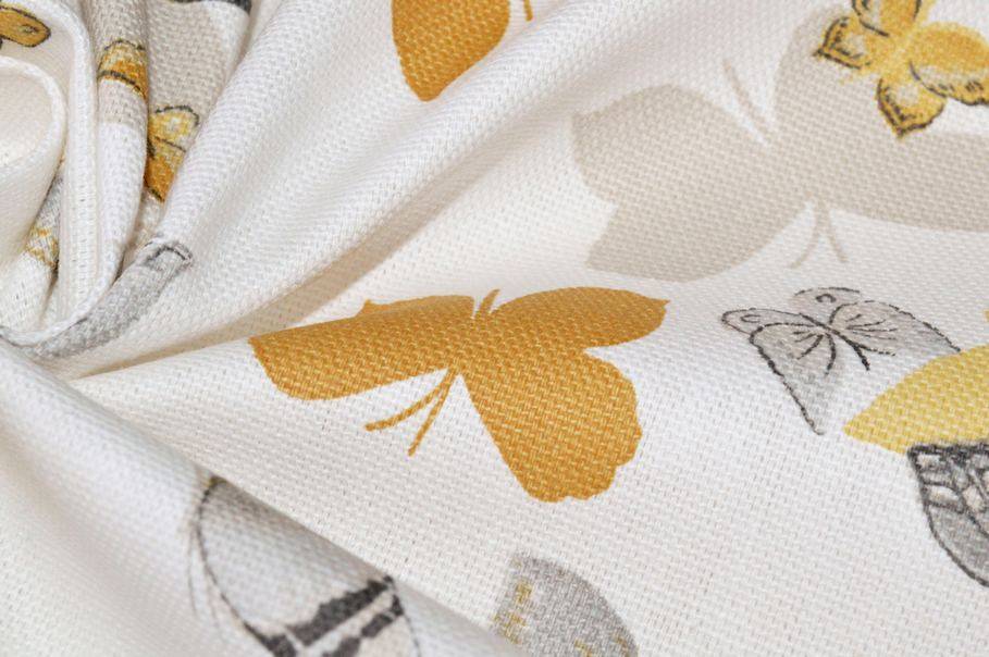 Bellissimo tessuto Panama interamente naturale realizzato in puro cotone. Il fondo presenta una base bianca impreziosita dal grazioso e delicato disegno raffigurante piccole farfalle gialle, grigio/tortora e beige. Molto indicato per confezionare tovagliati, lavori di arredo cucina come presine ed oggettistica varia ed altri progetti di cucito creativo.