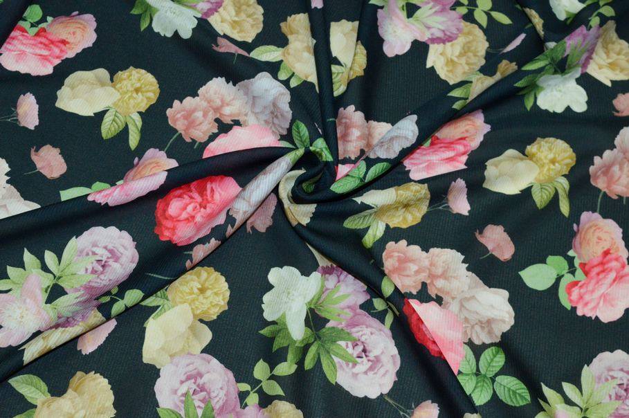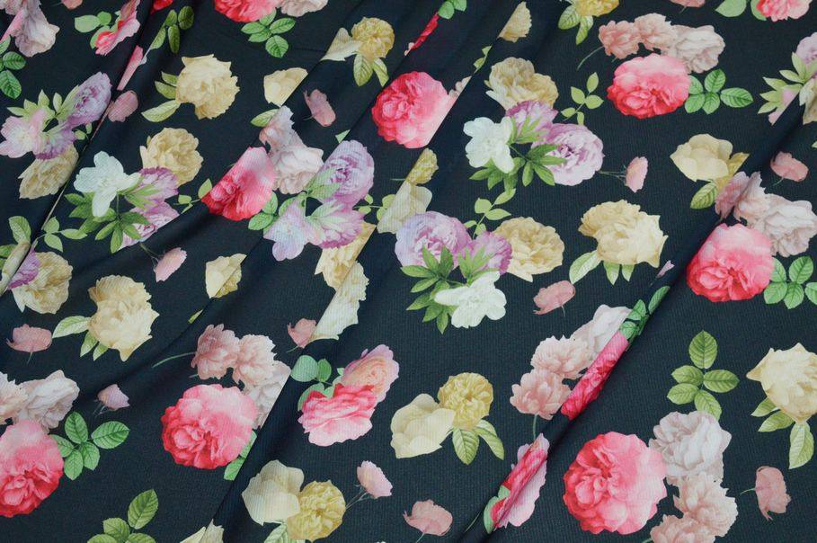 La base nera mette in risalto una vivace fantasia floreale con grandi rose lilla, gialle e rosa intenso, creando un contrasto elegante e d'impatto. Il fondo presenta inoltre una righina nera tono su tono che rende la base particolare ed unica.