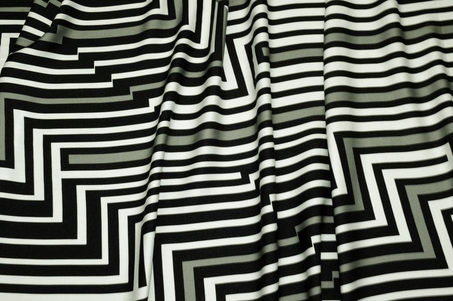 Il fondo sfoggia una bellissima fantasia geometrica nei toni del bianco e nero, impreziosita da un delicato dettaglio verde salvia che aggiunge carattere e unicità al tessuto e al capo finito.