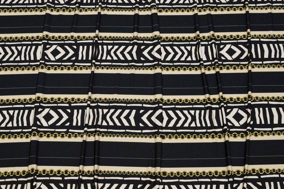 La fantasia propone una composizione elegante caratterizzata da righe orizzontali nere alternate a fasce beige di diverse dimensioni. Il design è arricchito da motivi in stile etnico e piccole catene giallo oro che percorrono il tessuto in modo perpendicolare alle righe, creando un effetto decorativo originale ed unico.