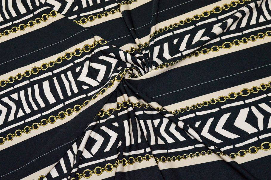 La fantasia propone una composizione elegante caratterizzata da righe orizzontali nere alternate a fasce beige di diverse dimensioni. Il design è arricchito da motivi in stile etnico e piccole catene giallo oro che percorrono il tessuto in modo perpendicolare alle righe, creando un effetto decorativo originale ed unico.