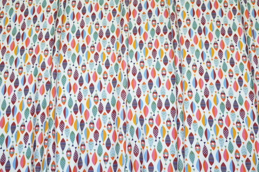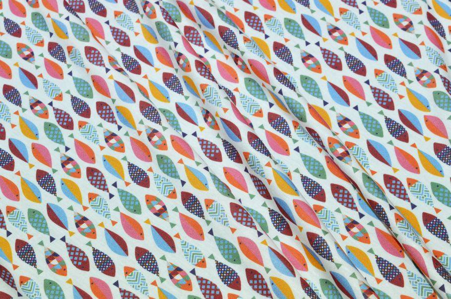 La fantasia, vivace e giovanile, presenta un fondo bianco decorato da tanti piccoli pesci colorati che donano alla stoffa un aspetto unico e giocoso.