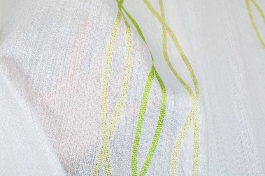 Ad impreziosirlo c'è una lavorazione geometrica composta da fasce ondulate color verde lime e verde mela, disposte a distanza di circa 26 cm l’una dall’altra. Questo decoro, elegante e originale, dona originalità al tessuto senza appesantirlo.