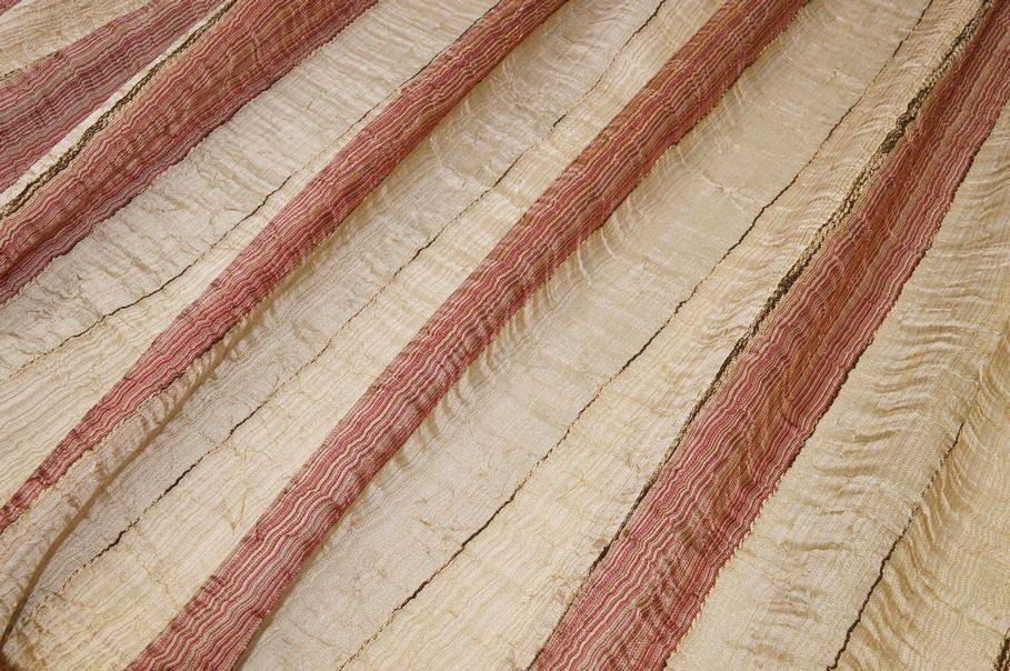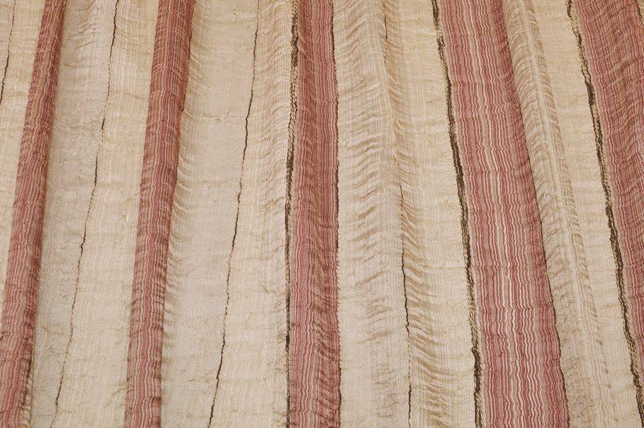 Perfetto per ambienti classici, questo tessuto si distingue per la fantasia a fasce verticali che alterna tonalità di beige a fasce rosse (rosso non intenso). Misura fasce rosse 7.5 cm.
