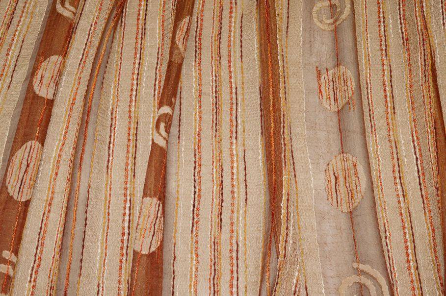 Tessuto in organza leggera e luminosa, caratterizzato da una fantasia a fasce verticali che alterna bande di media coprenza a sezioni trasparenti e filtranti alla luce.