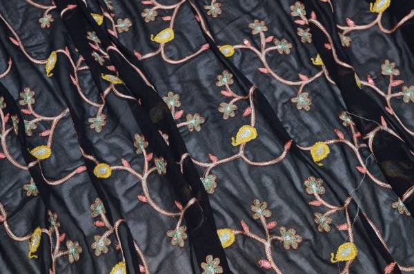 Il fondo nero è impreziosito da una raffinata lavorazione ricamata con piccoli fiorellini stilizzati, arricchiti da perline e paillettes cucite che donano luce e un tocco elegante al tessuto.
