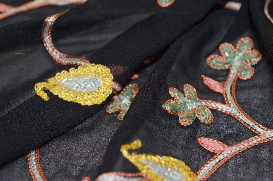 Il fondo nero è impreziosito da una raffinata lavorazione ricamata con piccoli fiorellini stilizzati, arricchiti da perline e paillettes cucite che donano luce e un tocco elegante al tessuto.