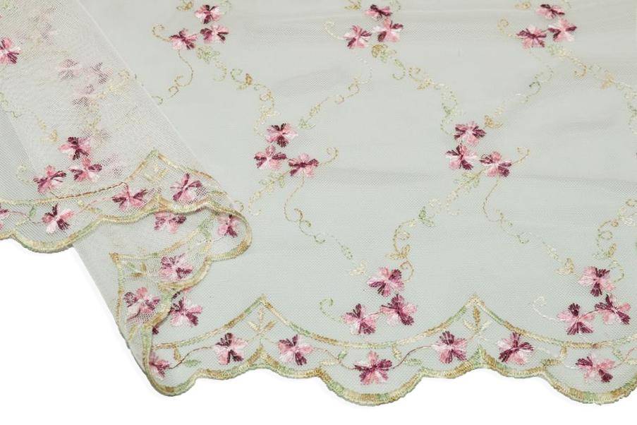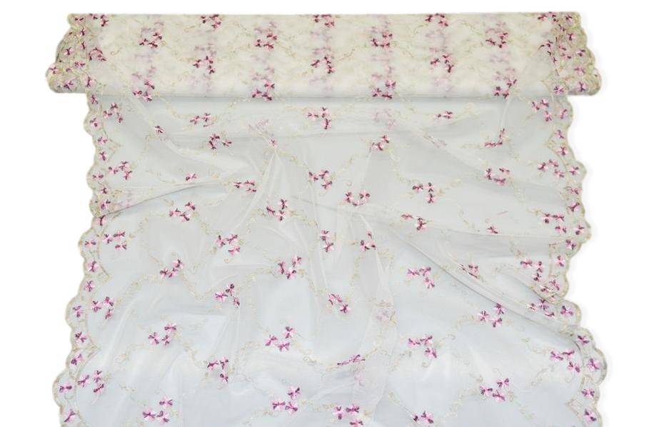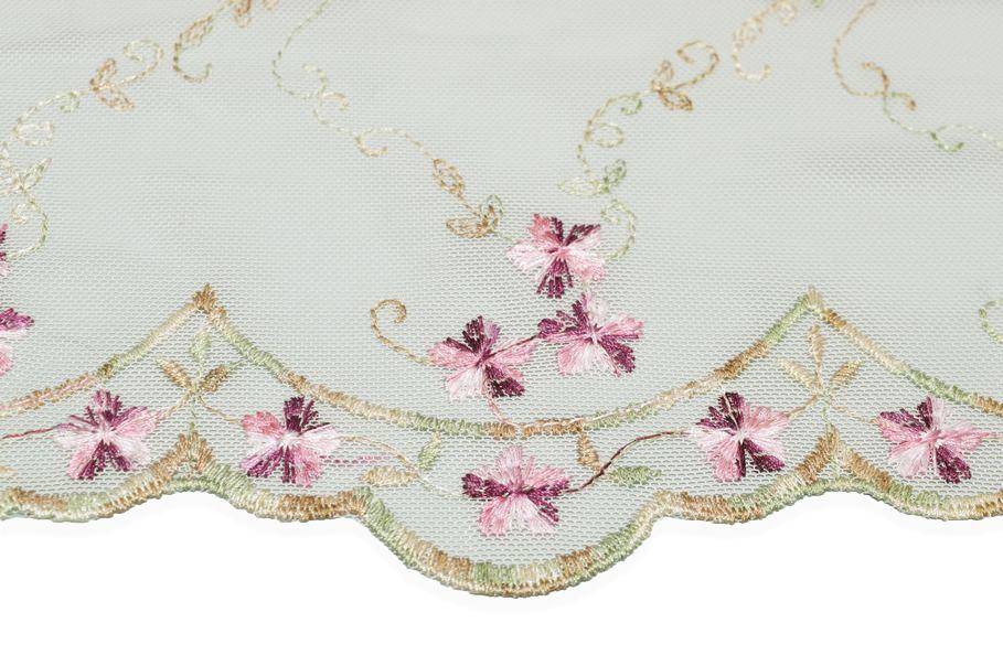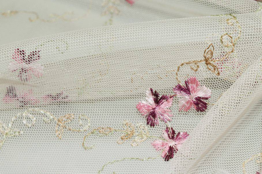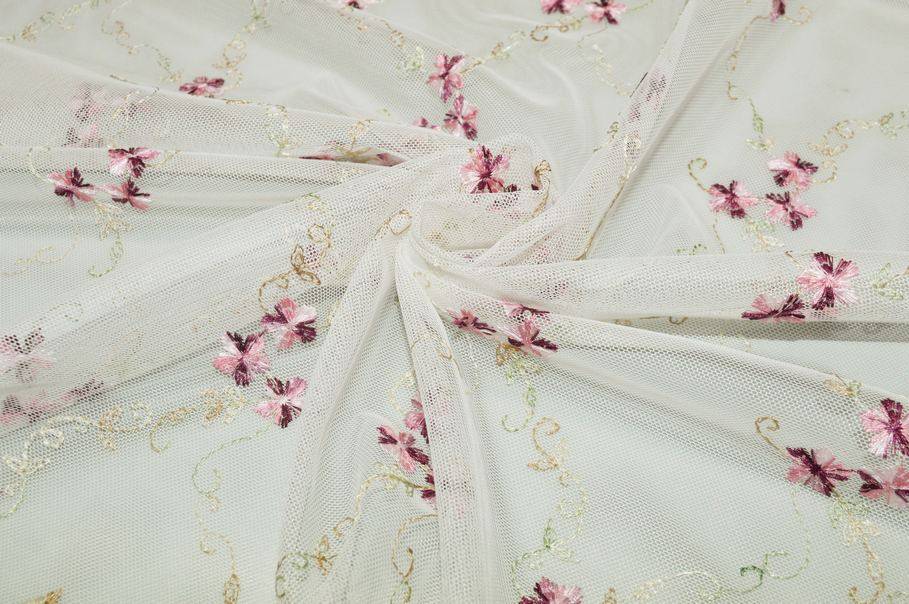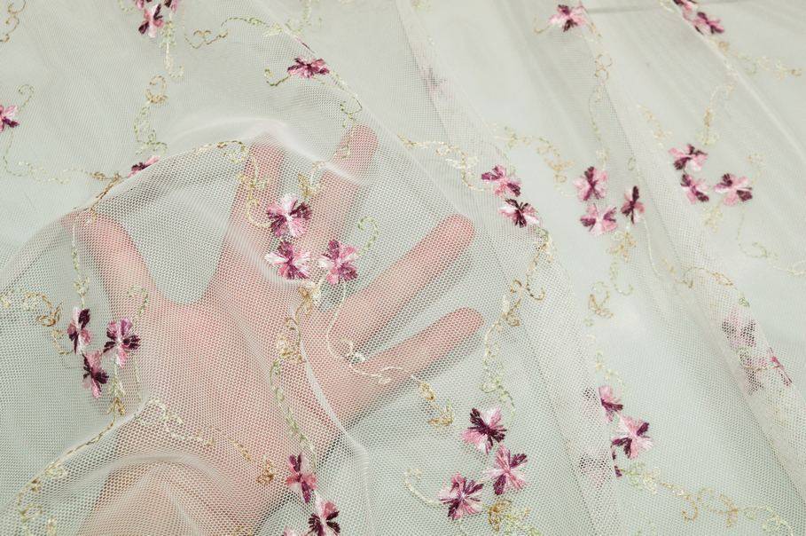 La base in tulle è impreziosita da un delicato ricamo di piccoli fiorellini nelle tonalità di fucsia e violetto, che aggiungono un tocco fresco e romantico al tessuto.