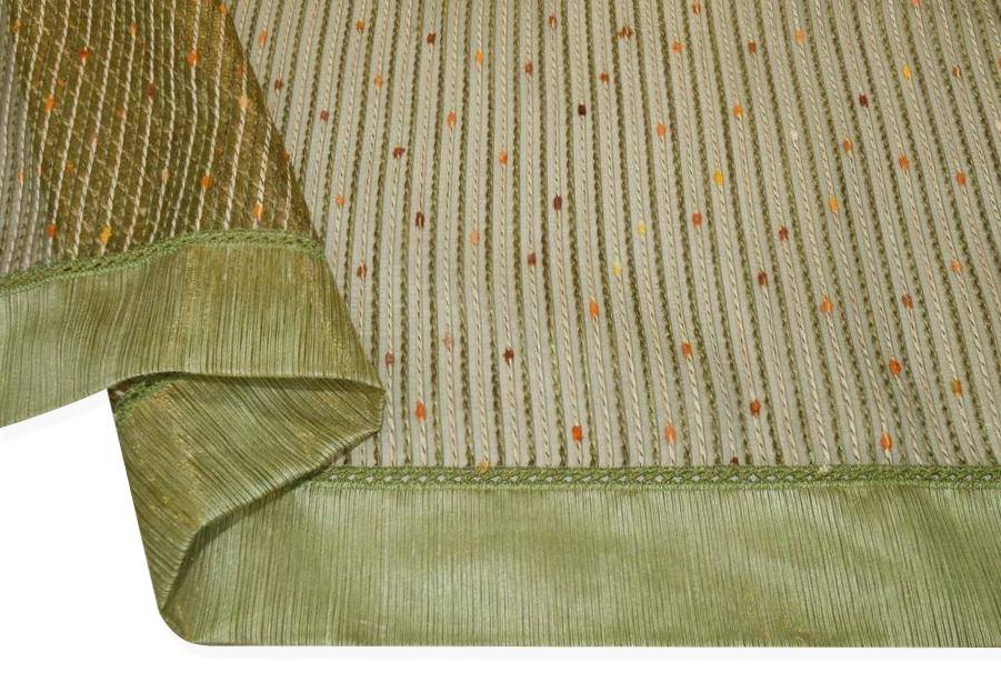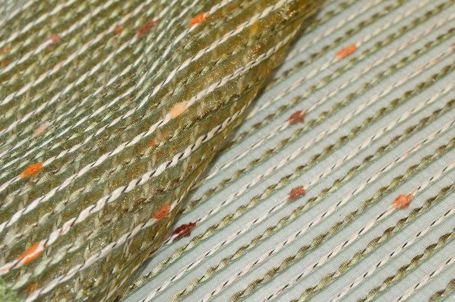 Tendino in organza leggera e luminosa, caratterizzata da una particolare finitura cangiante che, a seconda di come riceve la luce, riflette delicate gradazioni di verde e oro, donando dinamismo e brillantezza all’ambiente.
