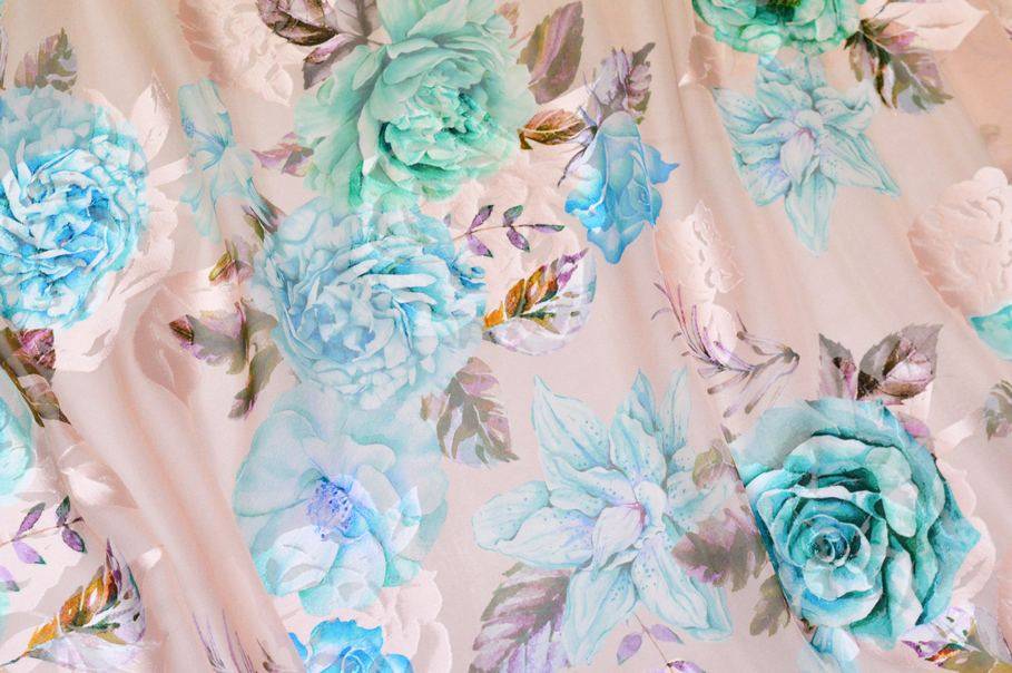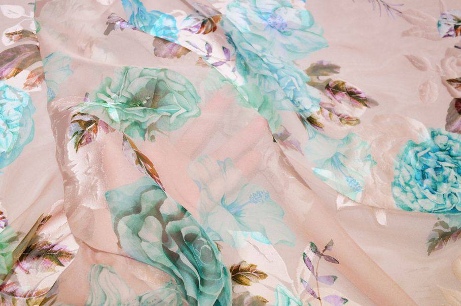 Tessuto in satin dévoreh misto seta e viscosa che unisce raffinatezza, leggerezza ed eleganza. La presenza della seta dona al tessuto una mano morbida, liscia e piacevolmente fresca, mentre la viscosa ne esalta la fluidità e la caduta naturale.