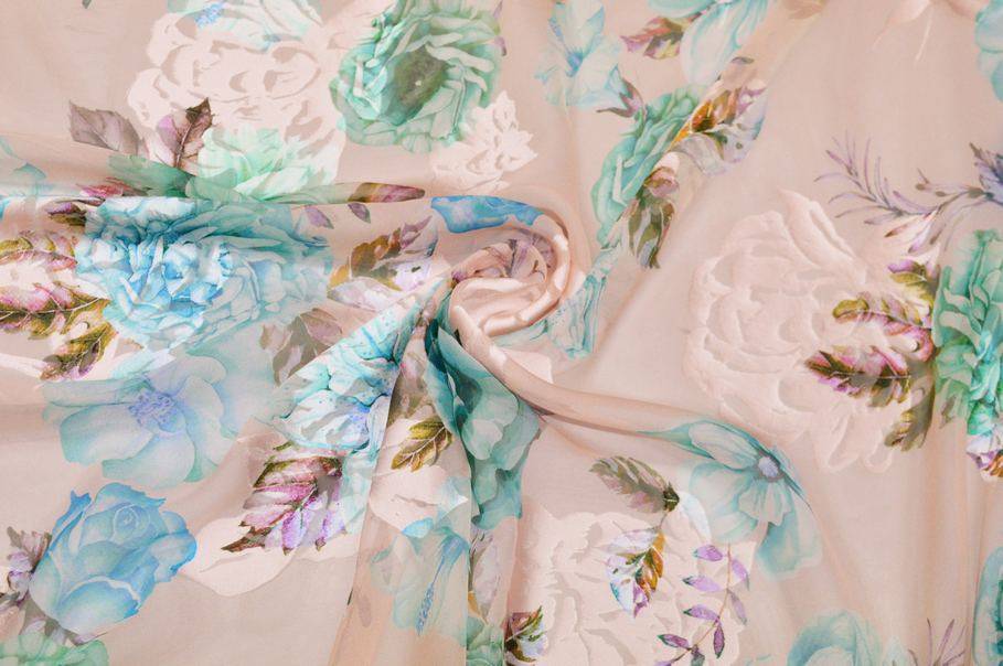 La stoffa presenta una superficie lucida e luminosa, che alterna a zone trasparenti ottenute tramite la tecnica dévoreh, che crea delicati giochi di pieni e vuoti per un effetto sofisticato e femminile.