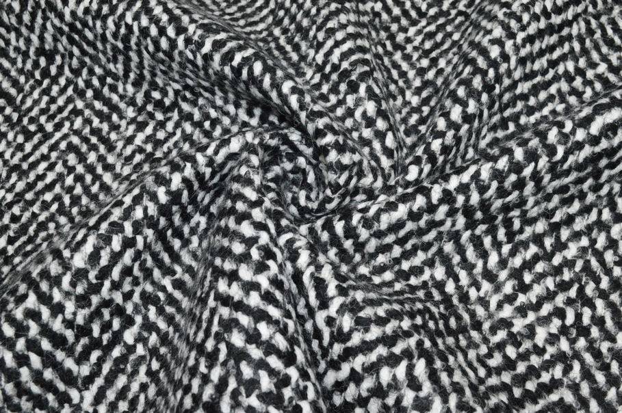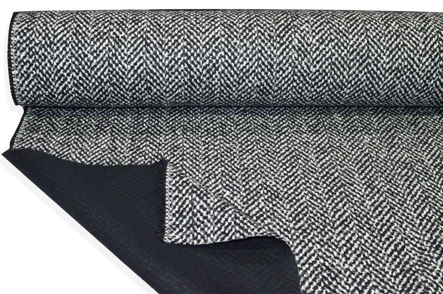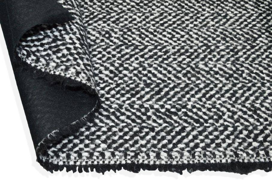 Il classico motivo a spina di pesce, con un rapporto di 7 cm, crea un effetto visivo marcato ma elegante, adatto a capi sia maschili che femminili. La base cromatica in bianco e nero garantisce versatilità e raffinatezza, mantenendo un forte impatto estetico.