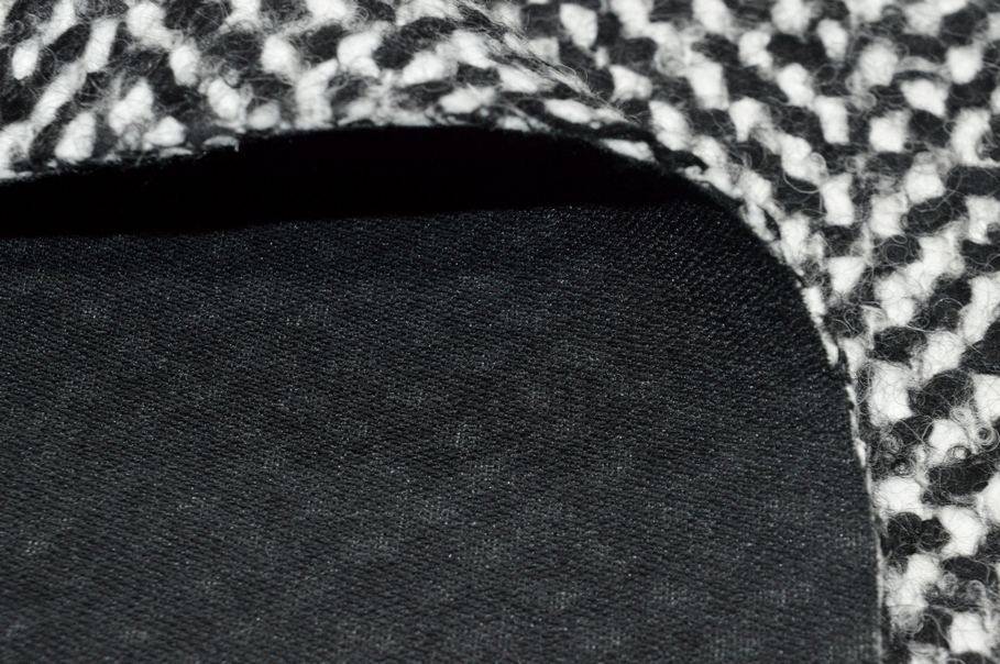 Tessuto in pura lana vergine con disegno spinato bianco e nero, adesivato sul rovescio(sul rovescio è già applicata la telina termoadesiva) per conferire maggiore struttura, stabilità e resistenza alla confezione. La mano calda e avvolgente, perfetta per capi autunnali e invernali dallo stile deciso e sartoriale.