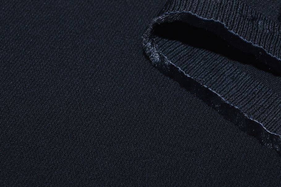 Tessuto crêpe cady stretch, colore blu scuro. Mano crepe al tatto cadente, morbida e leggermente elasticizzata. La presenza di una componente elastica nella trama garantisce una buona vestibilità e comfort durante l’indosso, mantenendo al contempo la stabilità del capo.