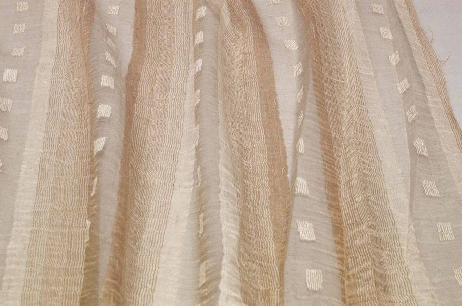 Tessuto indicato per la confezione di tende sia con onde morbide, sia con arricciature ricche e voluminose. Viene caratterizzato da una fantasia a fasce verticali che alterna bande di media coprenza a sezioni trasparenti e filtranti alla luce.