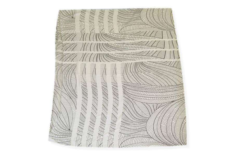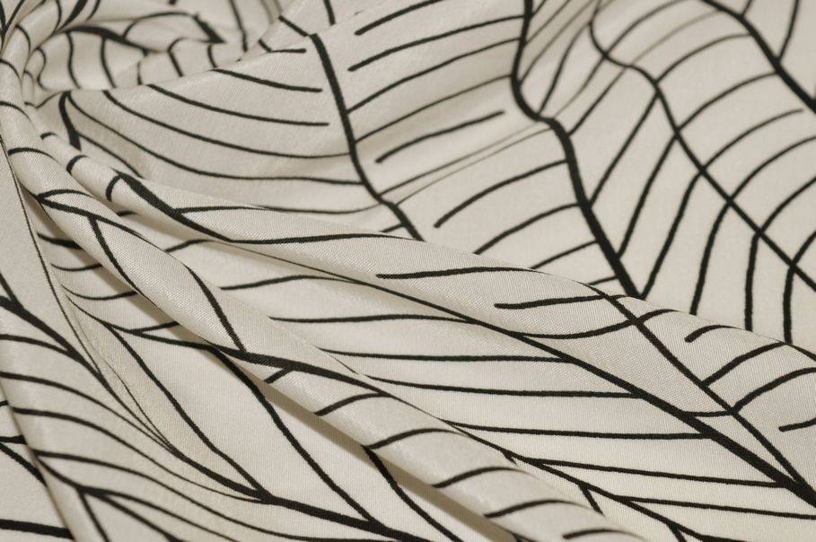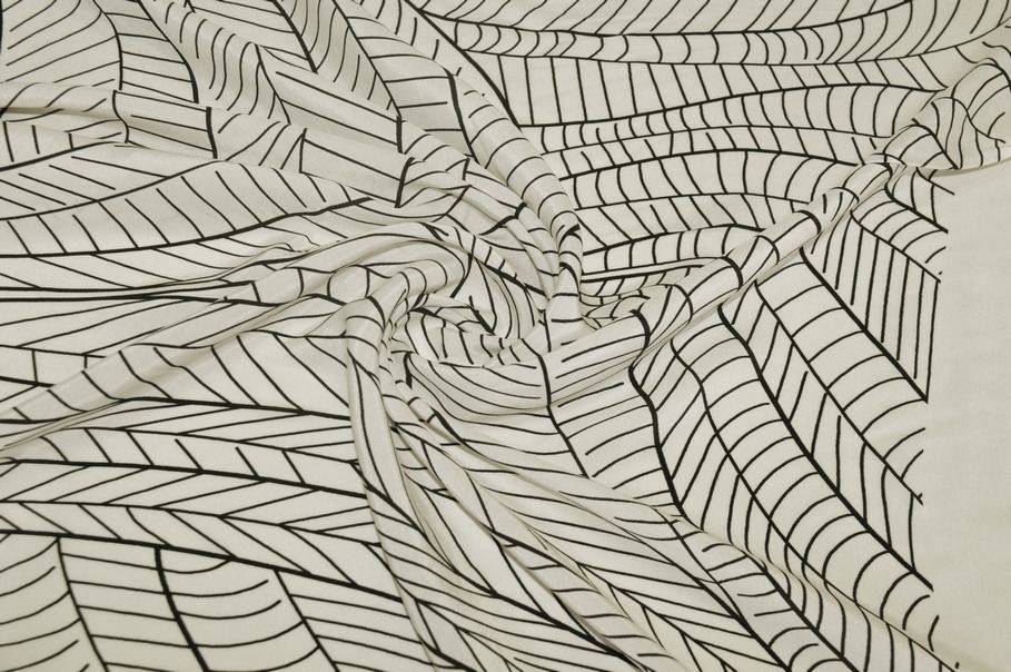 Il fondo presenta una fantasia astratta su base bianco naturale/panna molto chiaro, con linee nere che ricreano foglie stilizzate.