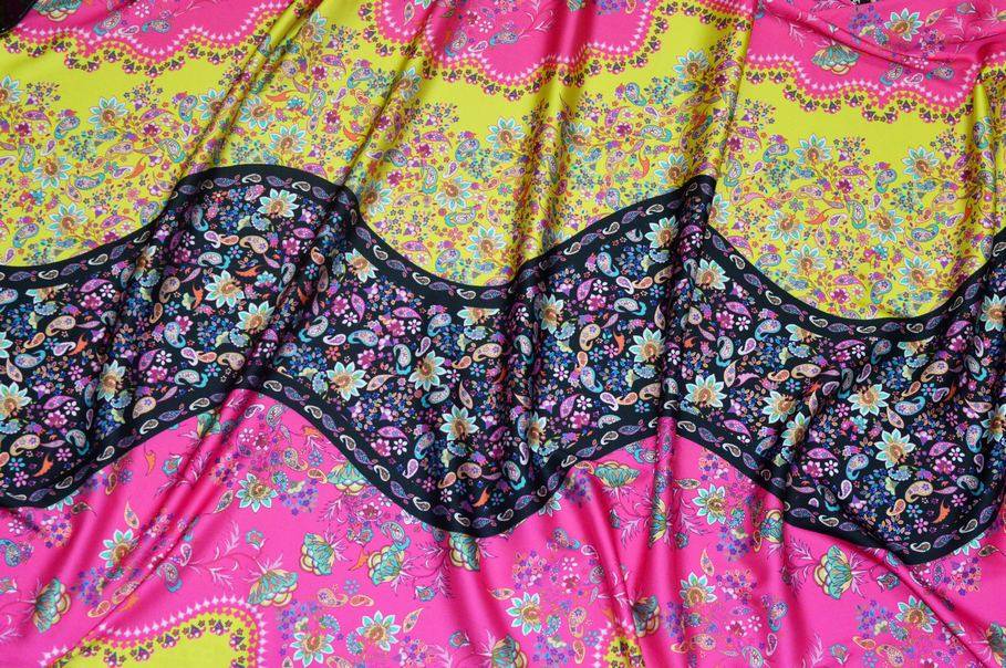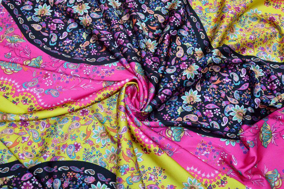TESSUTO RASATELLO ELASTICIZZATO FANTASIA CASHMERE GIALLO FUCSIA