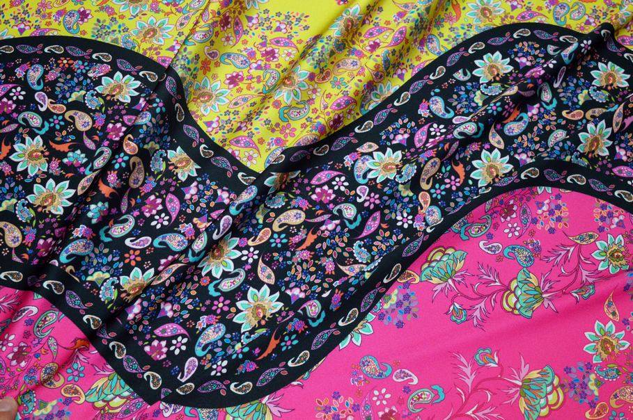 Vendita online tessuti abbigliamento poliestere tessuto rasatello elasticizzato fantasia cashmere giallo fucsia - Tessuti & Stoffe