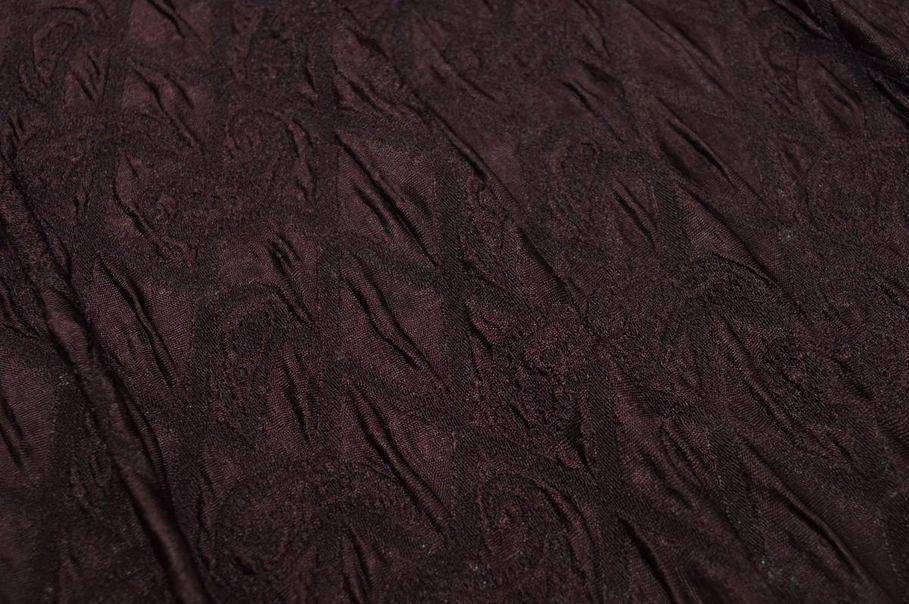 Il fondo presenta un'intensa gradazione color vinaccia con splendida lavorazione in tono con disegno cashmere. La superficie rimane inoltre leggermente luminosa. E' perfetto sia per capi casual sia per creazioni più formali. Ideale per gonne, pantaloni aderenti, maglie, gilet e abiti dal taglio raffinato.
