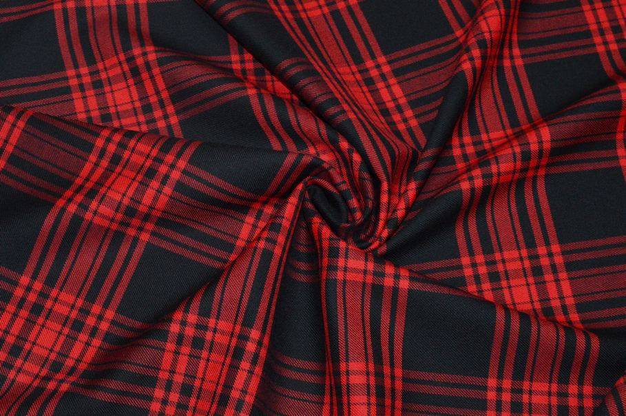 Tessuto in pura lana caratterizzato dall'iconica quadrettatura tartan nei toni del rosso e del nero. La superficie è morbida e piacevole al tatto, con una mano compatta e leggermente elastica che garantisce comfort durante l'indosso dei capi realizzati con questa stoffa.