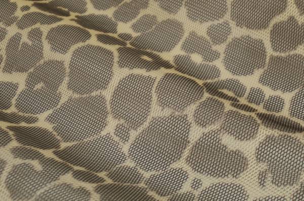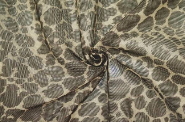 Rete trasparente con motivo animalier, caratterizzata da una struttura voluminosa e compatta che rimane comunque ariosa. La mano è sostenuta e la superficie si presenta uniforme, con un aspetto grafico che richiama le tipiche macchie animalier. La tenuta del tessuto consente di ottenere effetti tridimensionali e giochi di trasparenze, risultando adatto a lavorazioni creative, sovrapposizioni e capi scenografici.