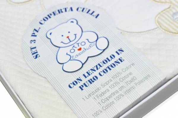 Composizione 100%cotone. Misura lenzuolo sopra cm 75x115, misura federa cm 37x26. Composizione coperta 100%cotone, imbottitura 100%poliestere. Misura coperta cm 70x80.