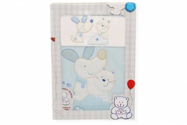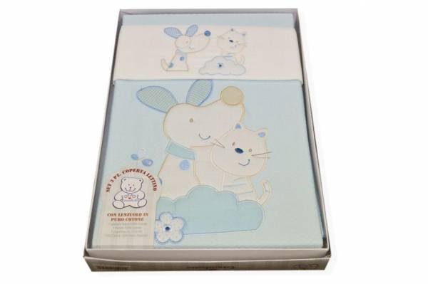 SET 3 PEZZI COPERTA LETTINO DISEGNO CANE E GATTO AZZURRO