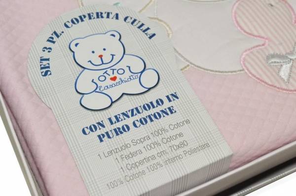 Composizione 100%cotone. Misura lenzuolo sopra cm 75x115, misura federa cm 37x26. Composizione coperta 100%cotone, imbottitura 100%poliestere. Misura coperta cm 70x80.