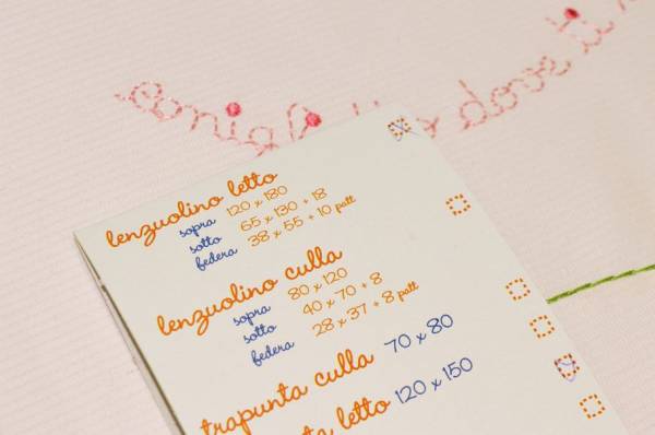 Composizione tessuto 100%cotone. Misura lenzuolo superiore cm 120x180, lenzuolo sotto cm 65x130 con angoli cm 18, federa cm 38x55 con pattina da 10 cm.