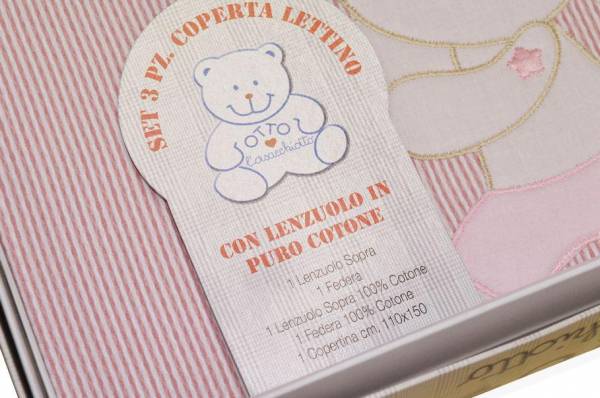 Composizione 100%cotone. Misura lenzuolo sopra cm 155x115, misura federa cm 51x37. Composizione coperta 100%cotone, imbottitura 100%poliestere. Misura coperta cm 70x80.