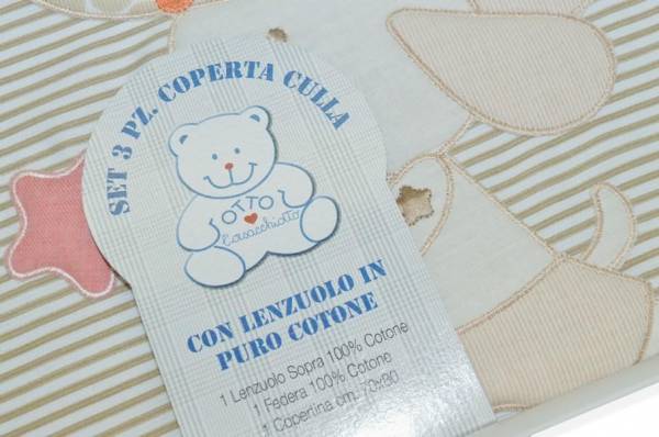 Composizione 100%cotone. Misura lenzuolo sopra cm 75x115, misura federa cm 37x26. Composizione coperta 100%cotone, imbottitura 100%poliestere. Misura coperta cm 70x80.