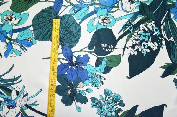Il fondo presenta una particolare fantasia floreale celeste/blu.