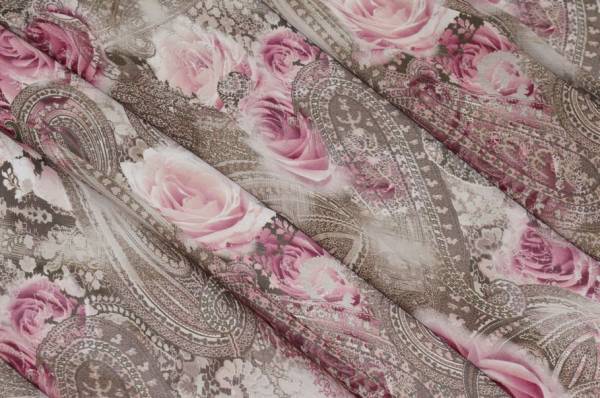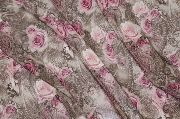 Ideale per camicie raffinate, abiti leggeri e stole coprispalla, questo tessuto si distingue per il suo design originale dove l’iconico motivo cashmere viene impreziosito da un delicato fiore rosa, che aggiunge una nota romantica in perfetto equilibrio tra eleganza classica e stile contemporaneo.