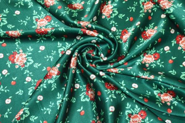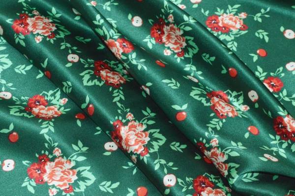 Raffinato raso di pura seta molto apprezzato per la sua superficie liscia e luminosa e per la mano morbida e scivolata che accarezza delicatamente la pelle. La fantasia viene posizionata su un elegante fondo verde smeraldo che enfatizza con un accattivante contrasto le nuance rosse dei piccoli fiori, un motivo fresco e originale che unisce grazia e personalità.