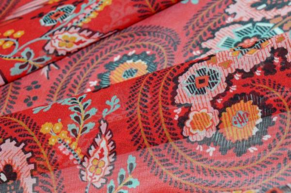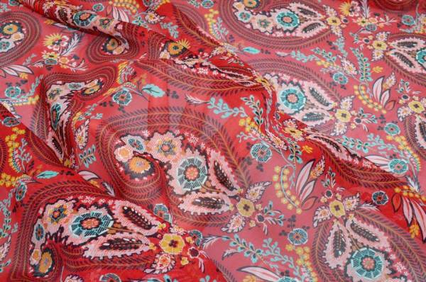 Raffinato tessuto georgette di pura seta caratterizzato dalla tipica superficie crepe, leggera e fresca al tatto. Una volta indossato, risulta cadente, svolazzante e leggermente trasparente, conferendo eleganza e movimento ai capi. Su un fondo rosso intenso, spicca l'inconfondibile motivo a goccia che caratterizza il bellissimo disegno cashmere, elegante e senza tempo.