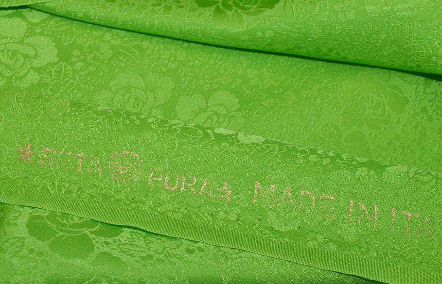 Tessuto pura seta jacquard con motivo floreale verde, di mano leggera e morbida, risulta leggermente cadente e coprente. Di grammatura ottimale per la realizzazione di camiciette, abitini, fodera e capi preziosi