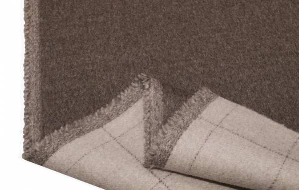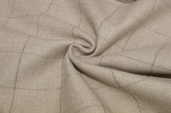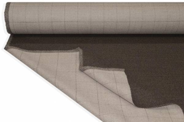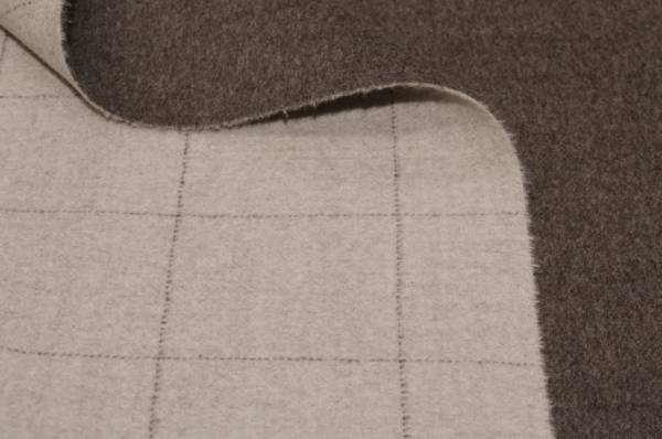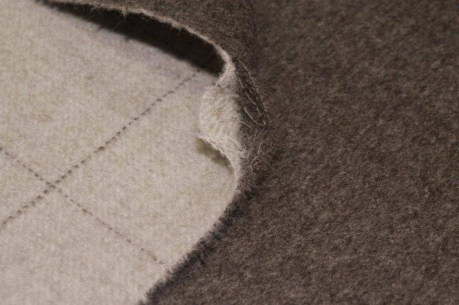 Tessuto double in pura lana lanificio Loro Piana colore tortora, dalla mano calda, avvolgente e morbida. La struttura double nasce dall’unione di due strati di tessuto, facilmente divisibili come mostrato nella foto dimostrativa.