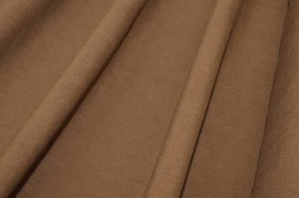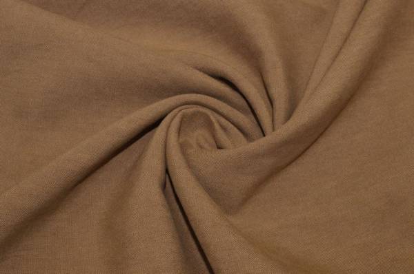 Lino puro di alta qualità in tonalità cammello, con mano leggera, fresca e piacevole sulla pelle. La grammatura medio/leggera assicura una buona coprenza e una trama compatta, senza però rinunciare alla traspirabilità e alla morbidezza del tessuto.
