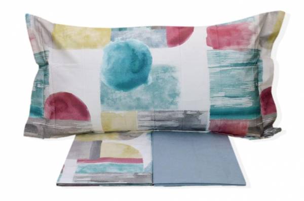 Composizione tessuto 100%percalle di puro cotone. Misura lenzuolo superiore cm 160x280, lenzuolo sotto cm 90x200x30, federa a 3 volani cm 50x80+20.