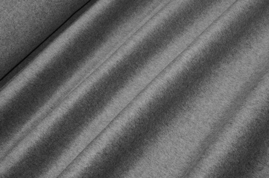 Pregiato tessuto in misto lana e cashmere grigio, caratterizzato da una mano straordinariamente morbida e calda. La superficie risulta vellutata e leggermente luminosa, conferendo un aspetto raffinato al capo finito.