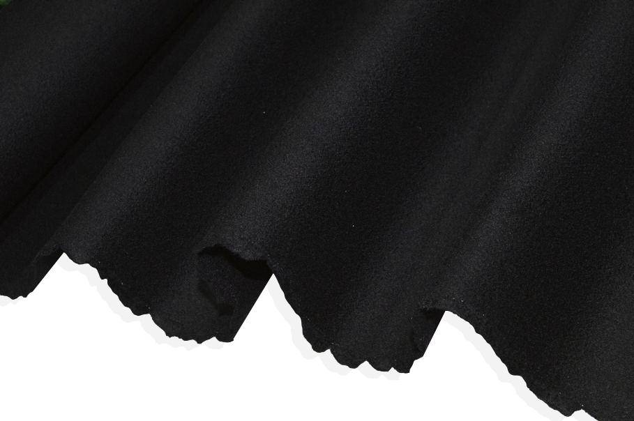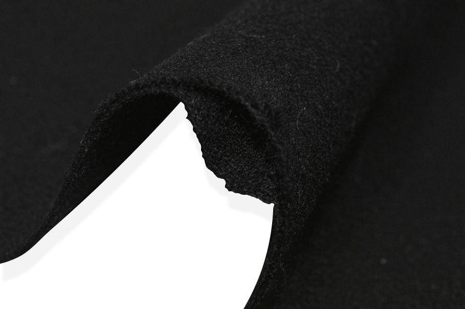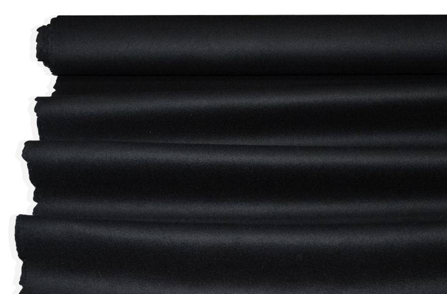 Pregiato tessuto in misto lana e cashmere nero, di grande eleganza, caratterizzato da una mano molto morbida e calda. La superficie si presenta inoltre leggermente luminosa conferisce un aspetto raffinato e curato al capo finito.