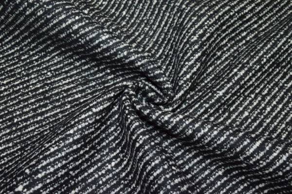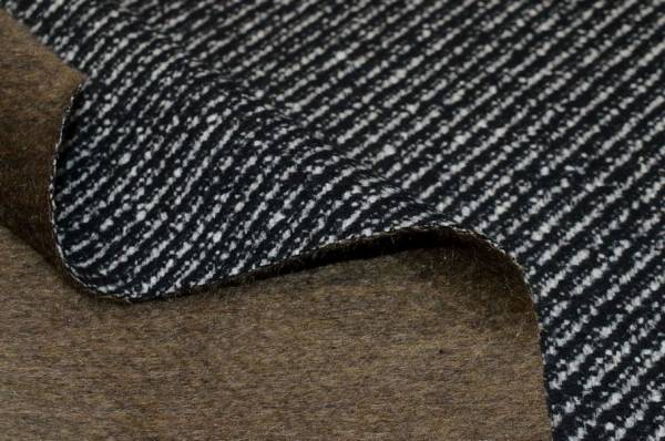 Questo articolo presenta due facce distintive: da un lato una particolare fantasia a diagonale nei toni del bianco e nero, dall’altro una particolarissima gradazione verde marcio/sottobosco. Una combinazione che apre a infinite possibilità creative, perfetta per confezionare cappotti e soprabiti con dettagli a contrasto o giochi di colore.