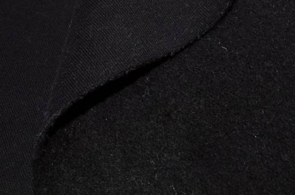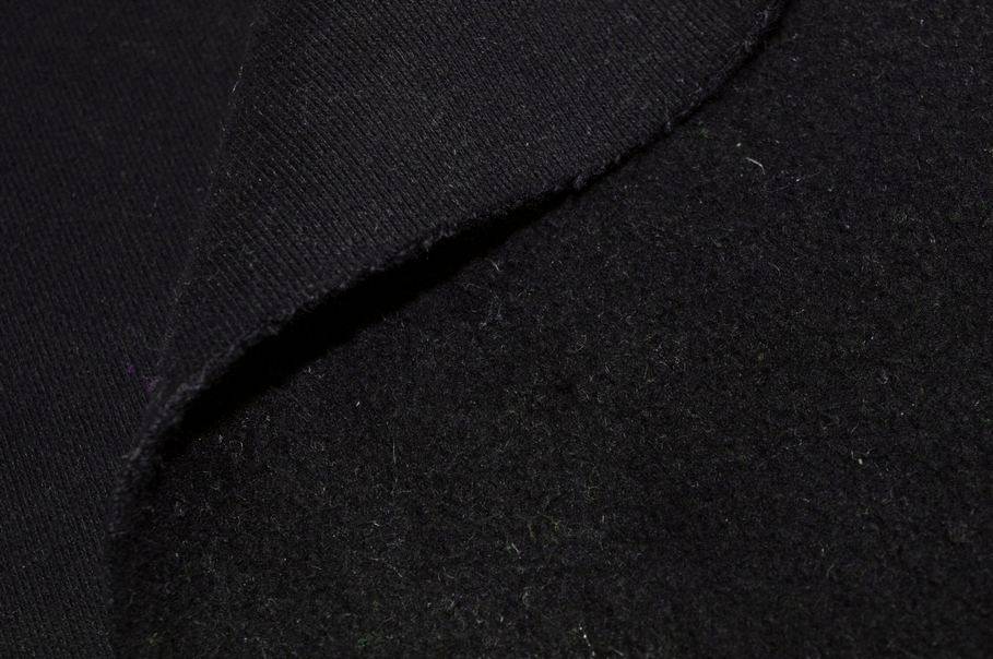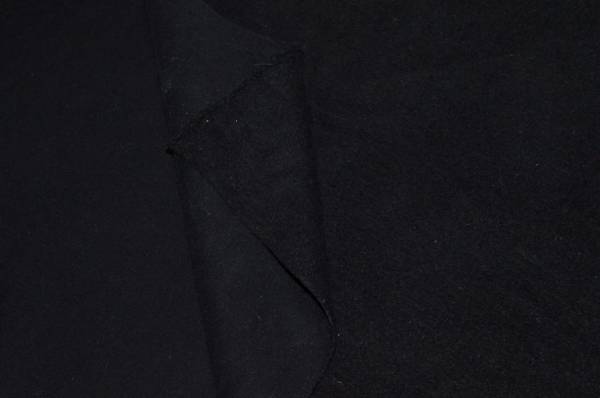 Tessuto felpa di seconda scelta in puro cotone, liscio sul dritto e con rovescio felpato che conferisce una mano calda. Si presenta in tinta unita nera ed è caratterizzato da una grammatura molto pesante e da una mano corposa, rigida e sostenuta. Queste caratteristiche lo rendono idoneo alla realizzazione di giacconi invernali.