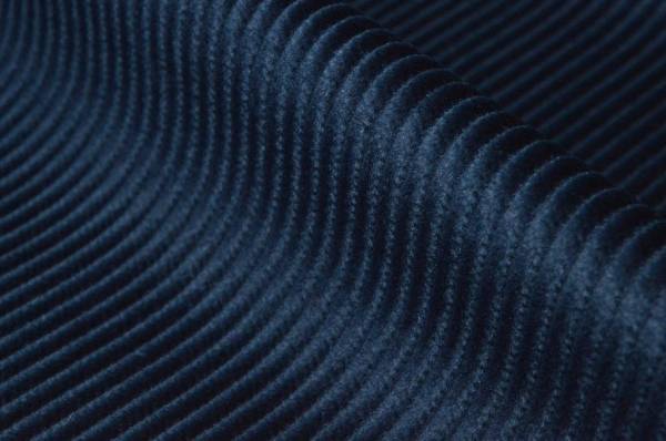 Tessuto di velluto a coste, riconoscibile per la sua superficie a costine in riglievo: ciirca 500 righe, ciascuna con una larghezza di 2 mm. La mano è morbida e vellutata, con una piacevole luminosità che valorizza la profondità del colore.