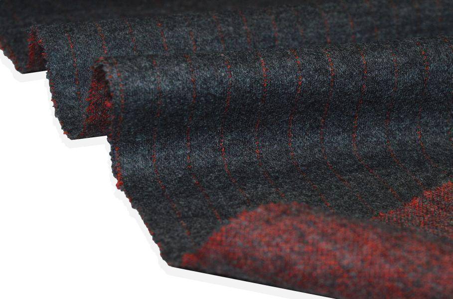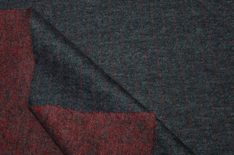 Jersey double in misto lana e cotone, ottenuto dall’unione di due strati separabili che rendono il tessuto versatile e strutturato. Un lato presenta una base rosso/grigio melange, morbida e avvolgente, mentre l’altro è grigio gessato con riga rossa.