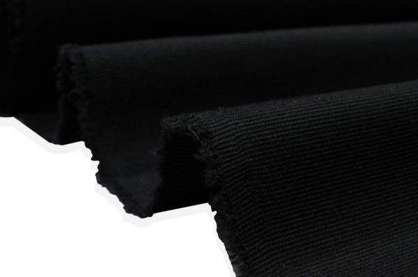 Tessuto jersey misto lana nero con micro costina, pensato per la realizzazione di capi confortevoli e avvolgenti per la stagione autunnale e invernale. La presenza della lana, unita alla struttura elasticizzata del jersey, conferisce al tessuto una mano morbida e calda, capace di adattarsi al corpo mantenendo una piacevole sensazione di comfort. La micro costina crea una delicata trama.
