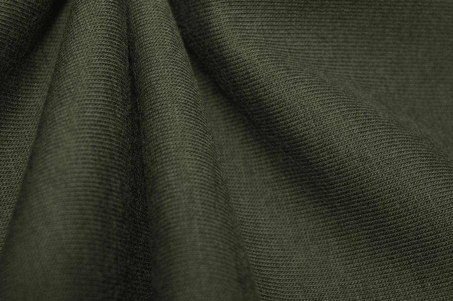 Tessuto in maglina di puro cotone, di mano morbida e leggera, proposto in una sobria tonalità verde militare.